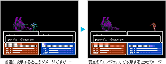 モンスターや空を飛ぶ敵には、弱点があります。モンスターは「せいなるつるぎ」や黒魔法「エンジェル」など、空を飛ぶ敵は「はがねのゆみ」などで攻撃すると、通常より多くのダメージを与えられます。 ![]() |