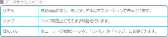 戦闘シーンのアニメーションの演出を変更できます。 ![]() |