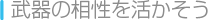 剣を持ったユニットで斧を持った敵を攻撃するなど、相性のいい相手を攻撃すると、こちらの攻撃は相手に当たりやすくなり、相手の攻撃はこちらに当たりにくくなります。 特に、「剣は斧に強い」「槍は剣に強い」「斧は槍に強い」という3すくみの関係は戦いの基本となるので、しっかりおぼえておきましょう。 |