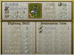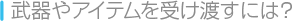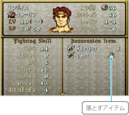 | 武器やアイテムは、ほかのユニットに直接受け渡すことはできず、いったん城下町の「中古屋」で売り、ほかのユニットが買い取ることによって渡すことができます。 また、一部のボスはアイテムを落とすことがあります。このような敵を倒すときは、そのアイテムを使えるユニットでとどめをさすようにするといいでしょう。なお、相手が落とすアイテムはステイタス情報のアイコンで確認できます。 |