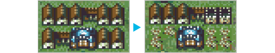 コマンドメニュー「むら」で入ったことのない村は、盗賊に破壊されることがあります。盗賊は毎ターン少しずつ村を破壊していき、門以外の場所をすべて破壊された村は消滅してしまいます。さらに、破壊された村では、「むら」を選んだときもらえるお金が、通常より減るので注意しましょう。 ![]() |