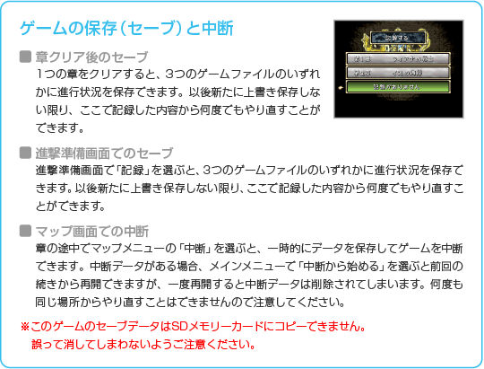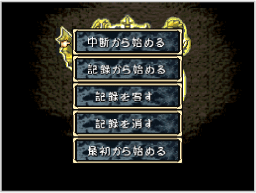 中断したところからゲームを再開します。なお、再開すると中断データは消えてしまいます。 |