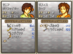 隣接している味方ユニットと持ち物を交換できます。また、捕えている敵ユニットや、かついでいる味方ユニットとの交換も可能です。交換する相手を選び、続いて持ち物を選んでください。 |