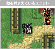 隣接した自分の「体格」よりも軽い敵ユニットを捕えます。「捕える」選択後、敵のHPを0にしたり魔法で眠らせてください。なお、敵を捕えている間は攻撃力が半減し、移動力も低下することがあるので注意しましょう。 |