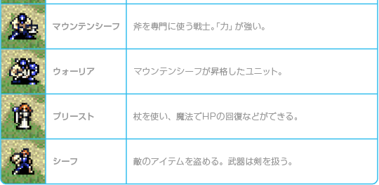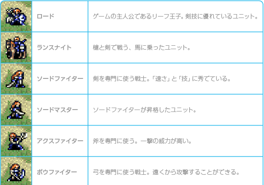 ゲーム序盤に登場するユニットを中心に紹介します。ユニットのなかには、特定の条件を満たすと上級クラスに昇格できるものもいます。