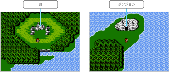 マップ画面には「フィールド画面」、「町・ダンジョン画面」の2種類があり、 |