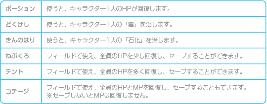 アイテムは道具屋で購入したり、宝箱から入手したりすることで手に入ります。 ここではアイテムの一部を紹介します。 ![]() |