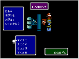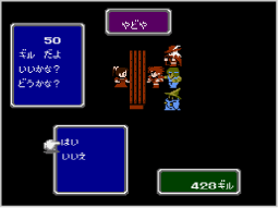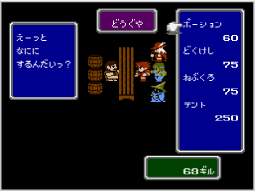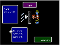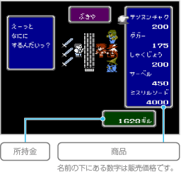 店に入ると、「かっていく」「うりつける」「みせをでる」の選択肢が表示されます。 買いたいときは「かっていく」を選んだあと、買いたい商品→持たせたいキャラクターの順に選ぶと、ギルを支払って商品を手に入れます。 売りたいときは「うりつける」を選んだあと、売りたい武器(防具)を持っているキャラクター→武器(防具)の順に選んでください。値段の確認後「はい」を選ぶと、武器(防具)を売ります。 途中の選択肢で |