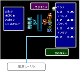 覚えさせたいキャラクター→覚えたい魔法の順に選んでください。値段の確認後「はい」を選ぶと、ギルを支払って魔法を覚えることができます。途中の選択肢で |