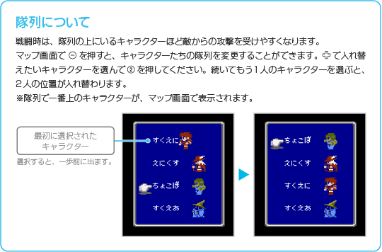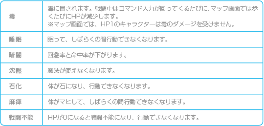 敵から特殊な攻撃を受けると、キャラクターが以下のような状態異常になることがあります。 状態異常には、戦闘中に回復するもの、戦闘終了時に回復するもの、魔法やアイテムを使わないと回復しないものがあります。 ![]() ※「毒」か「戦闘不能」のキャラクターは、戦闘終了後に自動的に隊列が一番最後になります。