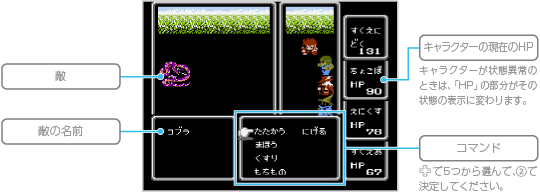 戦闘は、キャラクターに「コマンド」で指示を出して行います。まず、味方全員にコマンドを出しましょう。全員のコマンドを決定すると、味方と敵が1人ずつ行動します。味方と敵全員の行動が終わったら、再びコマンドで指示を出してください。 敵全員を倒すと勝利となり、経験値とギルが手に入ります。また、HPが0になったキャラクターは戦闘不能になり、味方全員が戦闘不能か石化になると全滅です。 ※「逃げる」に成功した場合も、戦闘は終わります。