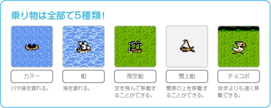 このゲームでは、船や飛空船といった乗り物を使って世界中を冒険します。 さまざまな乗り物を駆使して、世界のすみずみまで見て回りましょう。 |