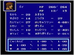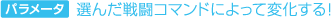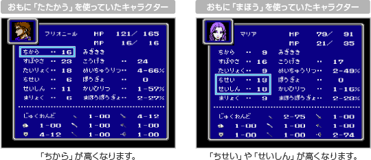 武器で攻撃する「たたかう」という行動では、「ちから」というパラメータが上がり、魔法で攻撃する「まほう」では、「ちせい」や「せいしん」が上がる、といった具合に、戦闘中の行動によって上がるパラメータが変わります。 どの能力を上げるか考えながら行動を選ぶのも、このゲームの醍醐味の1つです。 ![]() |