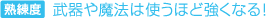武器や魔法には、それぞれ"熟練度"が設定されています。武器や魔法を使えば使うほど、それぞれの熟練度が上がり、熟練度が上がると、それぞれの威力が上がっていきます。 |