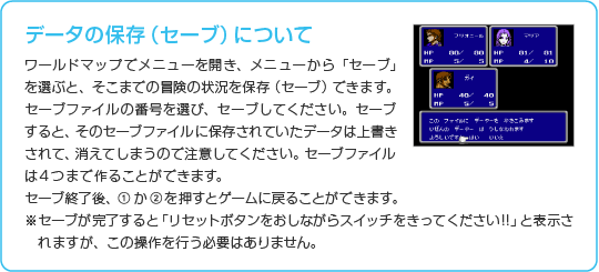 このゲームの目的は、反乱軍の戦士としてパラメキア皇帝が率いる悪の帝国と戦い、世界に平和をもたらすことです。「マップ画面」「メニュー画面」「戦闘画面」という3つの画面を行き来して、冒険を進めていきます。 |