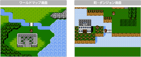 このゲームの中心となる画面です。ワールドマップ画面と町・ダンジョン画面の2つがあり、ワールドマップで移動して、ワールドマップ内にあるさまざまな町やダンジョンに入って冒険を進めていきます。 マップ画面では ![]() |