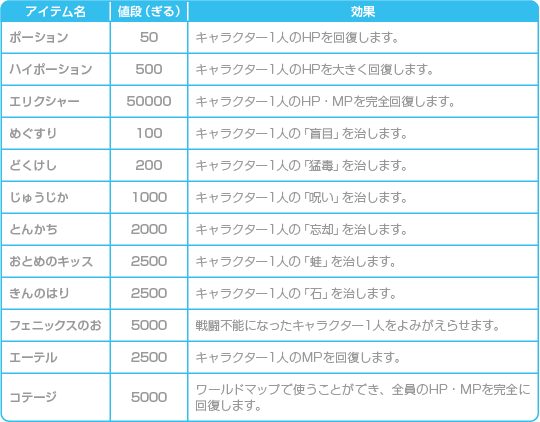 アイテムを買いたい場合は、「かう」を選んだあとに買いたいアイテムを選ぶと、お金(ぎる)を支払ってアイテムを手に入れます。アイテムを売りたい場合は「うる」→売りたいアイテムの順に選んでください。買い物中に なお、「ことわる」を選ぶと買い物をやめることができます。 ※武器や防具の装備は、メニュー画面の「そうび」で行います。