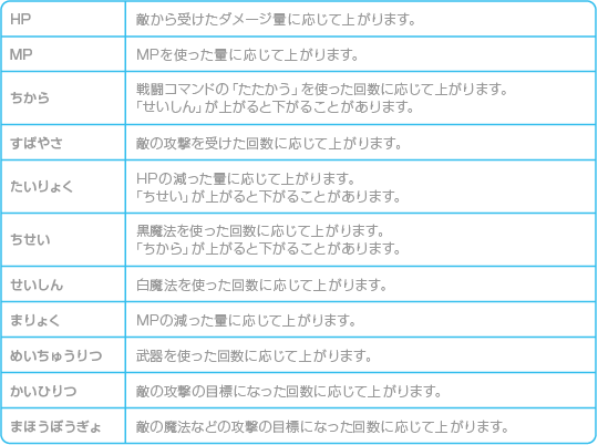パラメータのなかには、あるパラメータが上がると下がってしまうものがあります。たとえば武器での攻撃に影響する「ちから」が上がると、魔法での攻撃に影響する「ちせい」が下がってしまうのです。そのため、パラメータ全体を上げようとせず、攻撃方法や使う武器をある程度絞り込んだほうが、強いキャラクターを作り出しやすくなります。 キャラクターそれぞれに「武器での攻撃役」「魔法での攻撃役」などの役割を割り当てて、計画的に育成していくのがオススメです。各パラメータが上がる条件は下表のようになっているので、これを参考にキャラクターを育成してみてください。 ![]() |