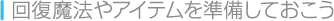| 冒険の途中には、思わぬところで強敵に出くわすこともあります。全滅してゲームオーバーになってしまわないように、事前に回復魔法の「ケアル」を覚えておいたり、回復アイテムの「ポーション」を装備したりしておいてください。 | ![]() |