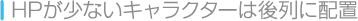 | 隊列で後列に配置したキャラクターは敵からの攻撃を受けにくくなります。最大HPが低いキャラクターなどは、後列に配置しておくのがオススメです。 | ![]() |