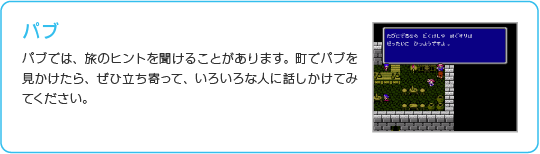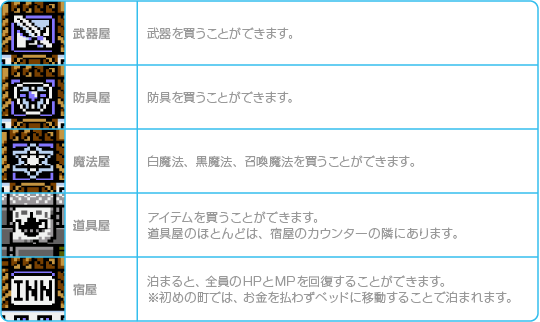 町には、お金(ギル)を支払って利用することができる、さまざまな施設があります。 |