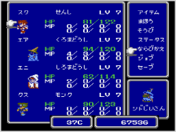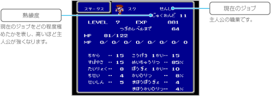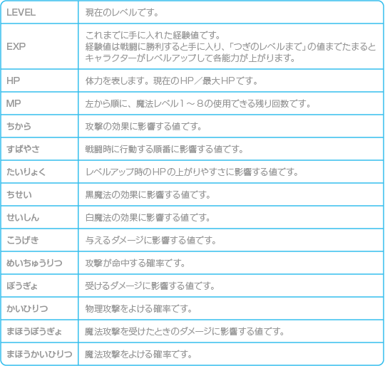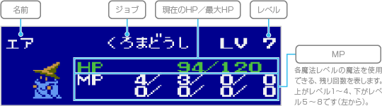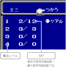 魔法にはそれぞれ1〜8の「魔法レベル」が設定されています。各キャラクターは、1つの魔法レベルにつき最大3つの魔法を覚えることができ、魔法を使った際にはその魔法レベルのMPが1減ります。 |