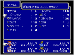 MPを消費して、覚えている魔法を使うことができます。使いたい魔法を選んでください。 キャラクターに対して使う魔法を選んだ場合は、続いて対象も選びます。なお、対象を選ぶ際に ※1人にしか使えない魔法もあります。
