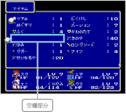 アイテムにカーソルを合わせて どちらかで空欄部分を選んだ場合は、その場所にアイテムが移動します。 ※入れ替えたあとに敵と戦闘すると、元の位置に戻ってしまいます。 |