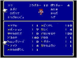 持っている武器や防具を装備できます。キャラクター→装備したい場所→装備品の順に選んでください。 「みぎて」と「ひだりて」には武器か盾を、「あたま」には兜を、「からだ」には鎧を、「うで」には腕輪や小手などをそれぞれ装備できます。なお、すでに装備している場所を選ぶと装備品をはずすことができ、「そうびかいじょ」を選ぶとすべての装備をはずします。 ※ジョブによって装備できる装備品が異なります。