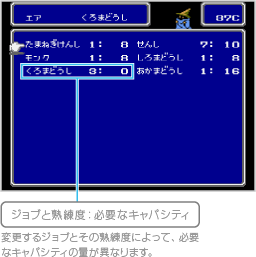 キャパシティを消費してジョブを変更できます。変更したいキャラクター→ジョブの順に選んでください。「ジョブチェンジしますか?」と表示されるので、変更する場合は |