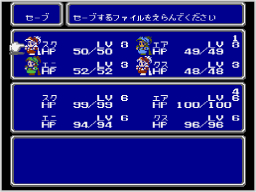 フィールド画面でメニューを開いたときのみ選択でき、これまでの状況をセーブすることができます。セーブしたいファイルを選ぶと前のデータを消すかどうか聞かれ、「はい」を選ぶとセーブします。 |