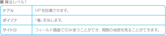 ※マップ画面だけ、もしくは戦闘だけでしか使えない魔法もあります。 |
