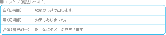 召喚魔法は、1つのレベルにつき1種類しかありませんが、使うジョブによって効果が変わります。 効果は「白」「黒」「合体」の3種類です。「白」と「黒」の効果を持つ召喚魔法を使えるジョブは幻術師で、どちらかの効果がランダムに発生します。「合体」の効果を持つ召喚魔法を使えるジョブは魔界幻士です。 ![]() ![]() |