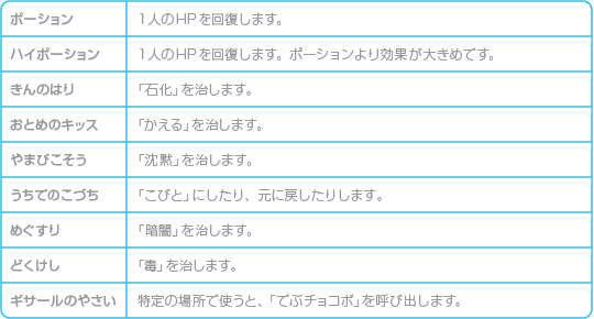 アイテムは、道具屋や宝箱から手に入れることができます。アイテムには、移動時や戦闘時に使える「通常アイテム」と、戦闘時のみ使える「戦闘アイテム」があります。ここではその一部を紹介します。