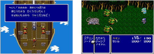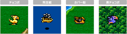 乗り物に乗ると陸地や空を快適に移動でき、行動範囲が広がります。乗り物は、チョコボ、飛空艇、ホバー船などがあります。 ![]() |