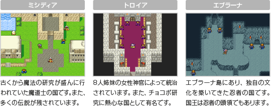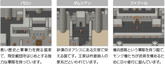 冒険ではバロン、ダムシアン、ファブール、ミシディア、トロイア、エブラーナの6カ国を巡ります。さらに、物語が進むと別の世界へも行けるようになります。広大な世界を旅しながら、さまざまな文化や特色を持つ人々との出会いを体験してください。 ![]() ![]() |