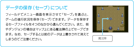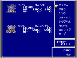 主人公セシルを操作して世界各地を冒険しながら仲間を集め、世界に平和をもたらすのがゲームの目的です。街やダンジョンのある「マップ画面」を移動し、「バトル画面」で敵と戦いながらゲームを進めてください。また、マップ画面で表示できる「メニュー画面」では、アイテムを使ったり並びかえを行うなど、さまざまなことができます。 |