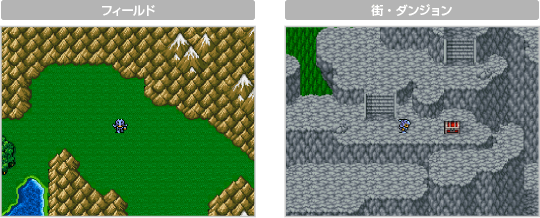 キャラクターを操作して目的地へ移動したり、情報を集めたりするなど、冒険の中心となる画面です。「フィールド」と「街・ダンジョン」の2種類があります。 ![]() |