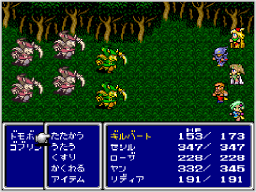 フィールドやダンジョンなどで敵に出会うとバトル画面になります。「バトルコマンド」で各キャラクターに指示を出し、敵と戦ってください。バトルに勝利すると経験値やお金(ギル)などをもらえます。 |