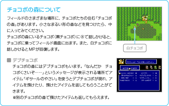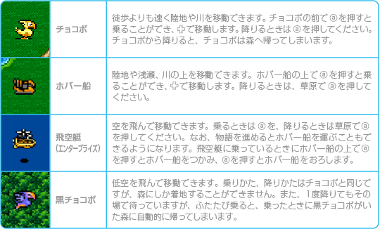 ゲームを進めていくと、さまざまな乗り物を手に入れることができます。乗り物に乗ることで、徒歩では行けなかった場所へも進めるようになり、行動範囲が広がります。なお、乗り物に乗っているときは、敵に遭遇することはありません。 ![]() |