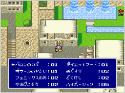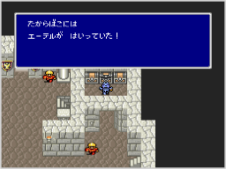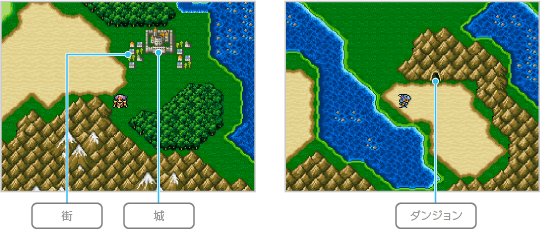 フィールド上には森や海、草原などさまざまな地形があり、地形によっては乗り物を使わないと移動できない場所もあります。また、街(城)やダンジョンがある場所までキャラクターを移動させると、その中に移動して、街・ダンジョン画面が表示されます。 ![]() |