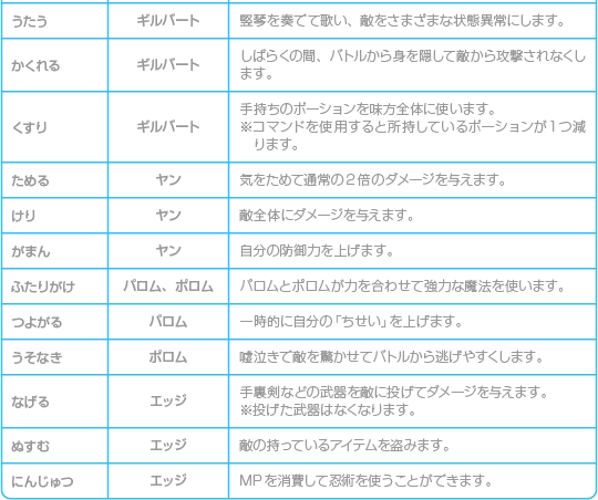 バトルコマンドは、キャラクターごとに使えるものが違います。ここで代表的なバトルコマンドを紹介します。