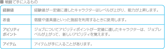 主人公たちは戦闘に勝つと、経験値(EXP)やアビリティポイント(ABP)を手に入れ、一定値まで達するとレベルアップして成長します。また、戦闘ではお金(ギル)も手に入り、アイテムをもらえることもあります。