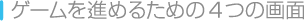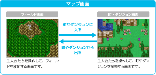 2種類のマップ画面で世界各地を冒険し、「戦闘画面」で敵と戦いながらゲームを進めてください。「メニュー画面」を表示すると、さまざまな情報を確認できます。 ![]() ![]() |