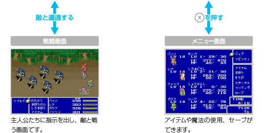 主人公たちを操作して世界各地を冒険しながらクリスタルを守り、世界に平和をもたらすのがゲームの目的です。 |