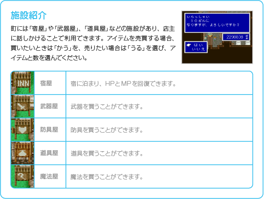 町には人々が暮らしていて、話して情報を得たり、さまざまな施設で買い物や休息ができます。ダンジョンでは敵が出現します。 ![]() |