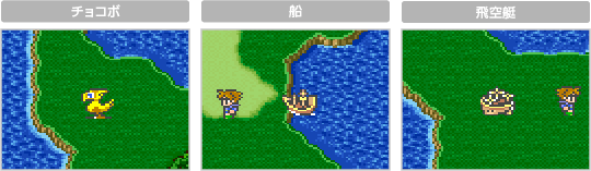 フィールド上には森や海、草原などさまざまな地形があり、乗り物を使うと通行できる地形もあります。また、町やダンジョンがある場所までキャラクターを移動させると、町・ダンジョン画面になります。