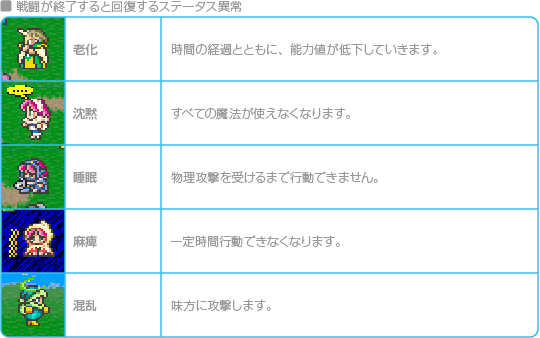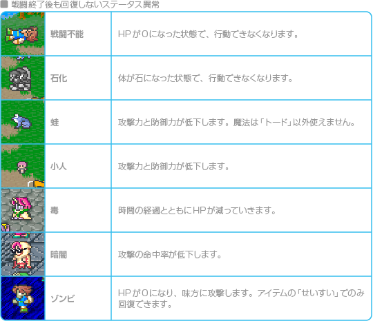 敵の特殊な攻撃を受けると、ステータス異常になることがあります。ステータス異常のなかには、戦闘終了時に回復するものと戦闘終了後も効果が続くものがあります。 ![]() ![]() |