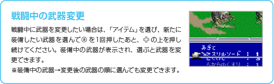素手、または装備している武器で敵を攻撃します。「たたかう」を選んだあと、攻撃する相手を選んでください。 |