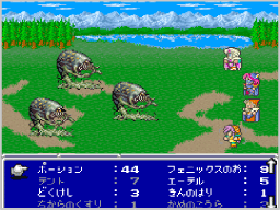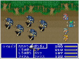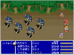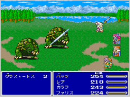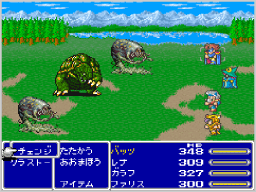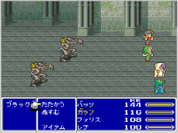 戦闘は、ATBゲージが満タンになったキャラクターのコマンドを選んで進めていきます。コマンドを選んで行動したキャラクターはATBゲージが減少し、ふたたびATBゲージが満タンになると行動できるようになります。敵をすべて倒すか、逃げるか、味方が全滅すると戦闘終了です。 |